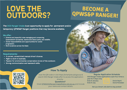 Liz Hill / Friday, January 23, 2026 / Categories: Employment, Government Ranger Intakes Qld Parks and Wildlife Services Qld Parks and Wildlife Services has intakes across the year throughout QLD. Previous Article Qld Government Jobs - Teacher & Educators Next Article Recuitement Police Officers Print 3 Rate this article: No rating